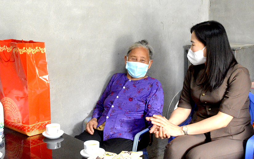 Đồng chí Ủy viên Ban Thường vụ Tỉnh ủy, Trưởng Ban Tuyên giáo Tỉnh ủy Nông Thị Bích Huệ thăm hỏi, tặng quà mẹ liệt sỹ bà Trần Thị Ơn, thôn Yên Thượng, xã Thanh Tương (Na Hang).