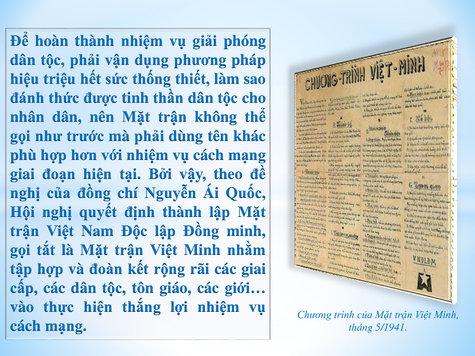 Tháng 10/1941, Việt Minh công bố Tuyên ngôn, Chương trình và Điều lệ, đây là lần đầu tiên một Mặt trận Dân tộc Thống nhất trình bày công khai đường lối, chính sách, phương pháp tiến hành và tổ chức lực lượng đấu tranh để thực hiện mục đích cứu nước của mình.