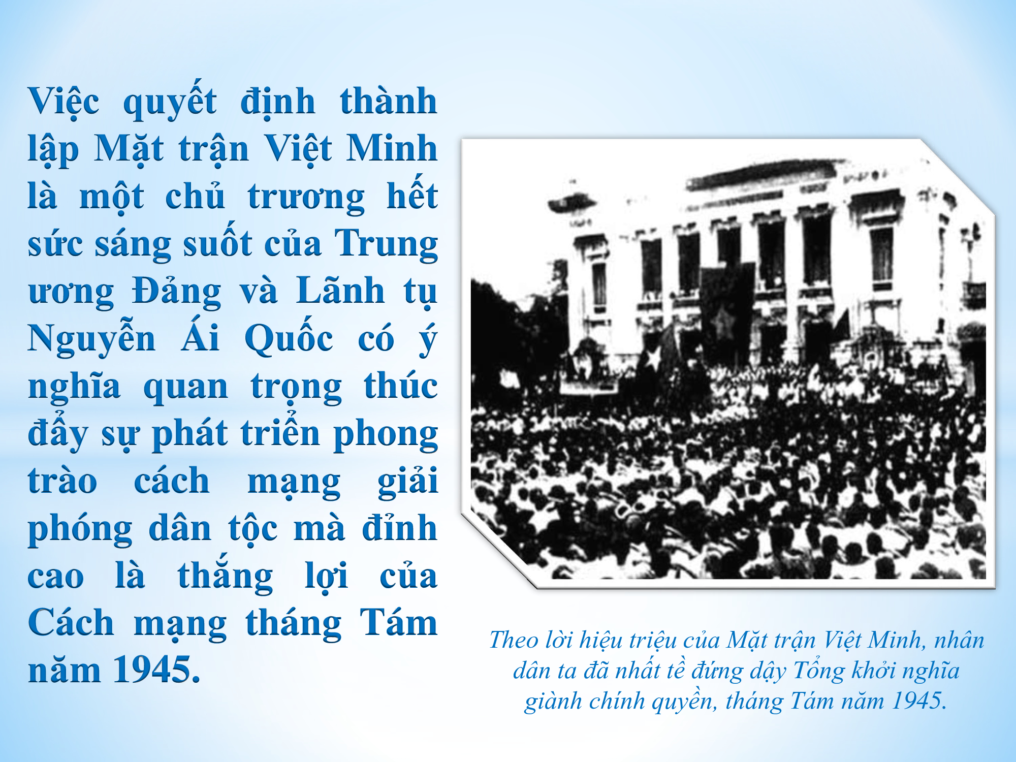 Ngày 19/5/1941, Mặt trận Việt Nam độc lập đồng minh (gọi tắt là Mặt trận Việt Minh) ra đời, thay cho Mặt trận Dân tộc thống nhất phản đế Đông Dương. Việc quyết định thành lập Mặt trận Việt Minh là một chủ trương hết sức sáng suốt của Trung ương Đảng và Lãnh tụ Nguyễn Ái Quốc, có ý nghĩa quan trọng vào sự phát triển phong trào cách mạng giải phóng dân tộc mà đỉnh cao là thắng lợi của Cách mạng tháng Tám năm 1945.
