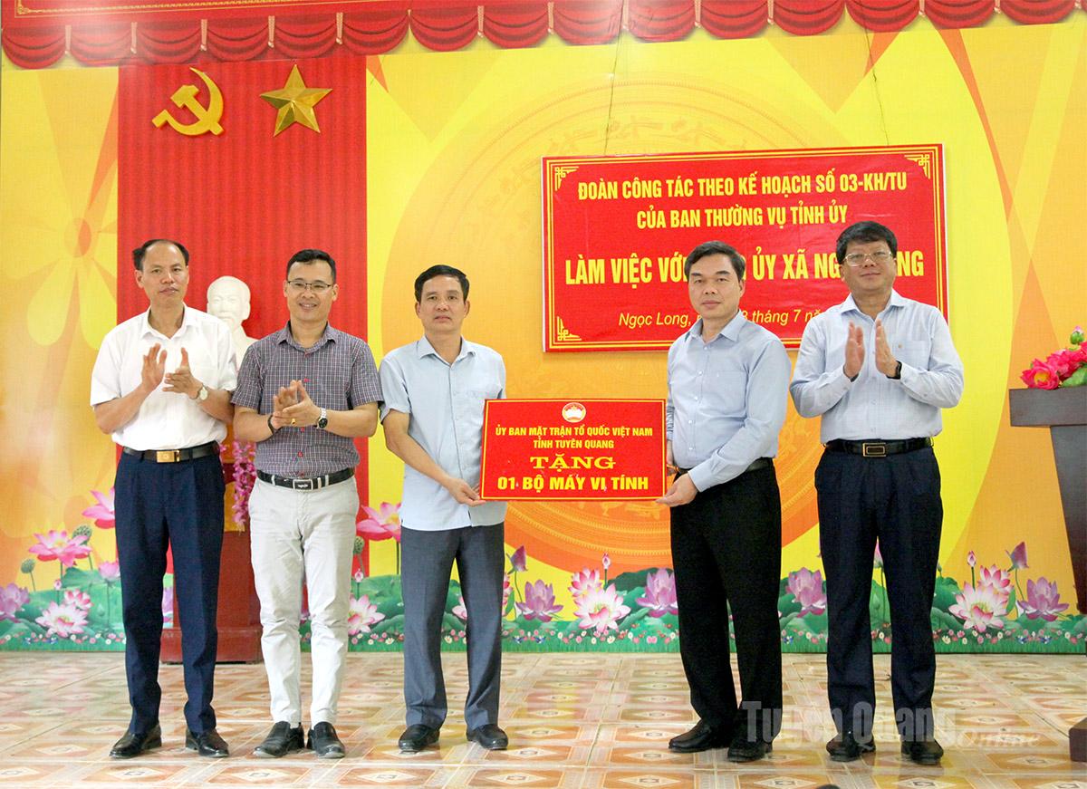 | Đoàn công tác tặng máy tính cho xã. |