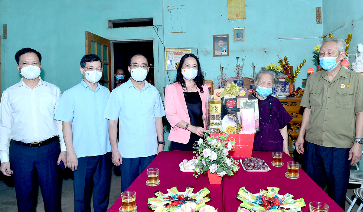Phó Chủ tịch nước Võ Thị Ánh Xuân và lãnh đạo tỉnh tặng quà bà Nguyễn Thị Nhân, mẹ liệt sỹ ở tổ Vĩnh Thiện,