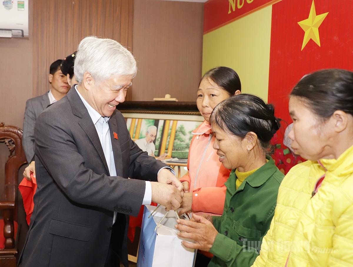 Phó Chủ tịch Thường trực Quốc hội Đỗ Văn Chiến và Chủ nhiệm Uỷ ban Văn hoá - Xã hội của Quốc hội Nguyễn Đắc Vinh tặng quà các gia đình chính sách xã Tân Trào. |