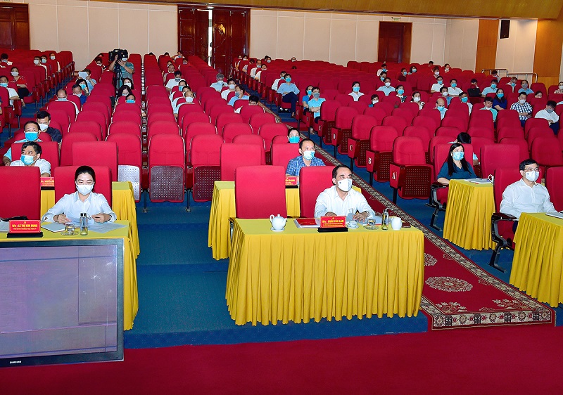 Các đồng chí lãnh đạo tỉnh và các đại biểu dự hội nghị tại Trung tâm Hội nghị tỉnh. Ảnh: Thành Công