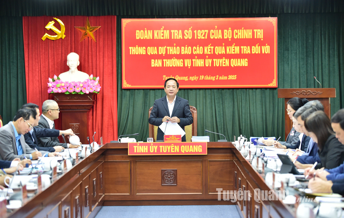 Tại buổi làm việc, các đại biểu đã nghe Đoàn kiểm tra trình bày Dự thảo báo cáo kết quả kiểm tra việc lãnh đạo, chỉ đạo và tổ chức quán triệt triển khai, tổng kết Nghị quyết 18-NQ/TW ngày 25/10/2017 của BCH Trung ương Đảng khóa XII về “một số vấn đề về tiếp tục đổi mới, sắp xếp tổ chức bộ máy của hệ thống chính trị tinh gọn, hoạt động hiệu lực, hiệu quả” và Kết luận 121-KL/TW ngày 24/1/2025 của BCH Trung ương Đảng, gắn với việc thành lập và hoạt động của các đảng bộ mới; việc tổ chức thực hiện Chỉ thị 35-CT/TW ngày 14/6/2024 của Bộ Chính trị về “đại hội đảng bộ các cấp tiến tới Đại hội đại biểu toàn quốc lần thứ XIV của Đảng; việc quán triệt triển khai và tổ chức thực hiện Nghị quyết 57-NQ/TW ngày 22/12/2024 của Bộ Chính trị về “đột phá phát triển khoa học, công nghệ, đổi mới sáng tạo và chuyển đổi số quốc gia”; việc thực hiện Kết luận 123-KL/TW ngày 24/1/2025 của Ban Chấp hành Trung ương Đảng về “Đề án bổ sung về phát triển kinh tế - xã hội năm 2025 với mục tiêu tăng trưởng đạt 8% trở lên”.
