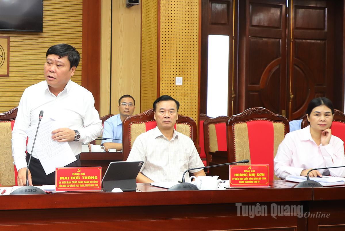 Tổng Biên tập Báo và phát thanh, truyền hình Tuyên Quang Mai Đức Thông thảo luận tại buổi làm việc.