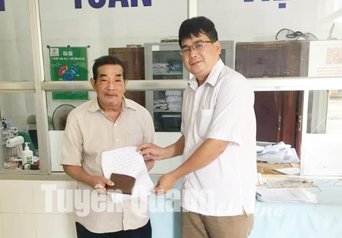 Sáng 8-9, trong quá trình làm việc tại Phòng Thu viện phí, Trung tâm Y tế huyện Na Hang, anh Hỏa Văn Vọ, cán bộ Phòng Thu viện phí, có nhặt được một chiếc ví. Ngay sau đó, anh Vọ đã báo với bộ phận quản lý để thông báo trên hệ thống của cơ quan. Sau 1 giờ thông báo, ông Phạm Văn Thắng, tổ 6, thị trấn Na Hang (Na Hang) chủ nhân của chiếc ví đã đến làm thủ tục giao nhận tài sản. Được biết trong ví của ông Thắng có hơn 12 triệu đồng.